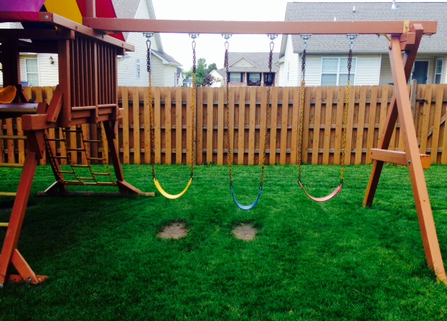 Our swing set has had lots of love, evident by the brown spots under each swing – the red one was just recently hung, so it still has a layer of grass beneath it. I watched my daughter – our youngest – struggle to pump her legs like her brothers, and when she accomplished her feat, we all clapped for her. Now she can run outside when she wants to, and from my kitchen window, I watch her swing happily as I cook (or put a frozen pizza in the oven).